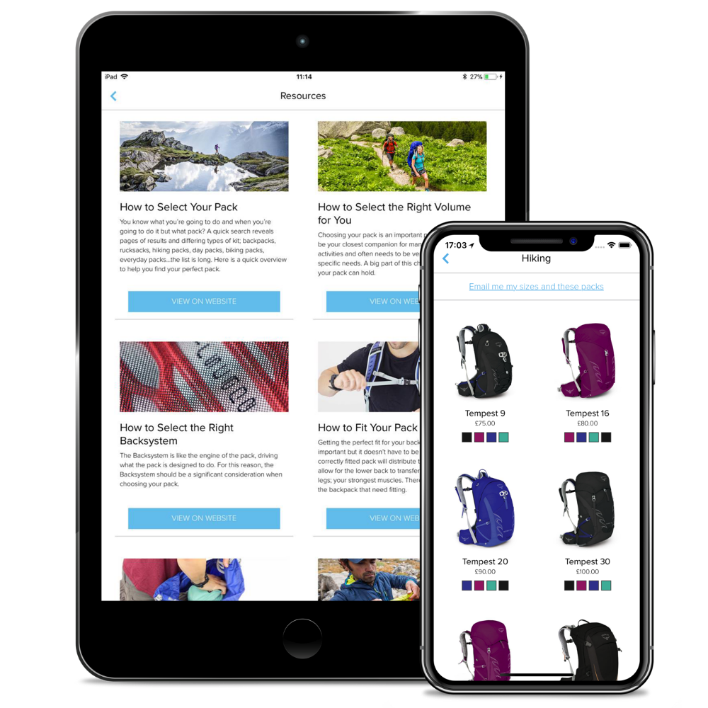 Nachdem Sie diese drei Schritte durchlaufen haben, bewertet die App, welche Rucksackgrößen von Osprey Ihnen am besten passen. Die Größen der Rückensysteme werden am häufigsten als S, M und L oder S/M und M/L angegeben, wundern Sie sich also nicht, wenn die App Ihnen gleich zwei Optionen anzeigt. Wenn Ihnen die ermittelte Größe nicht passend erscheint, können Sie den Vorgang einfach mit einem weiteren Foto wiederholen. Schließlich können Sie in der App Ihren Traumrucksack nach Aktivitätstyp auswählen oder nach dem Klicken auf den Tab Resources in zahlreiche Anleitungen eintauchen, wie Sie den richtigen Rucksack auswählen und an Ihre Figur anpassen. Sie erfahren auch, wie Sie den Rucksack reinigen oder alles Notwendige am praktischsten darin verstauen.